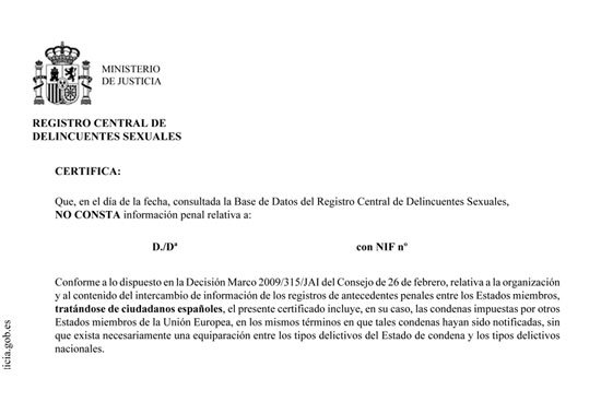 El certificado de Delitos de Naturaleza Sexual, según la normativa de españa, es el único certificado válido que se expide para trabajar frecuentemente con inferiores.